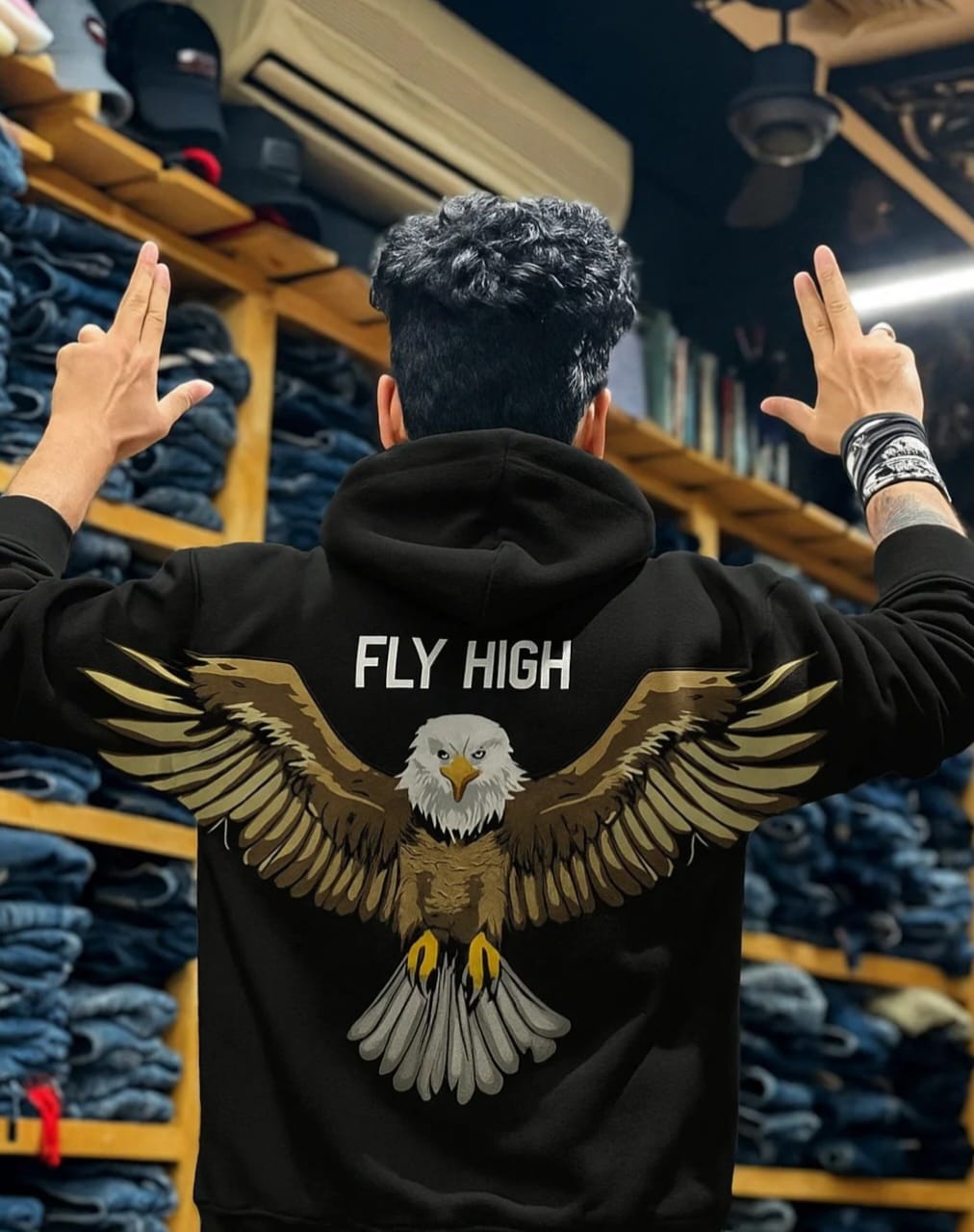 Bold eagle back print with “FLY HIGH” text
